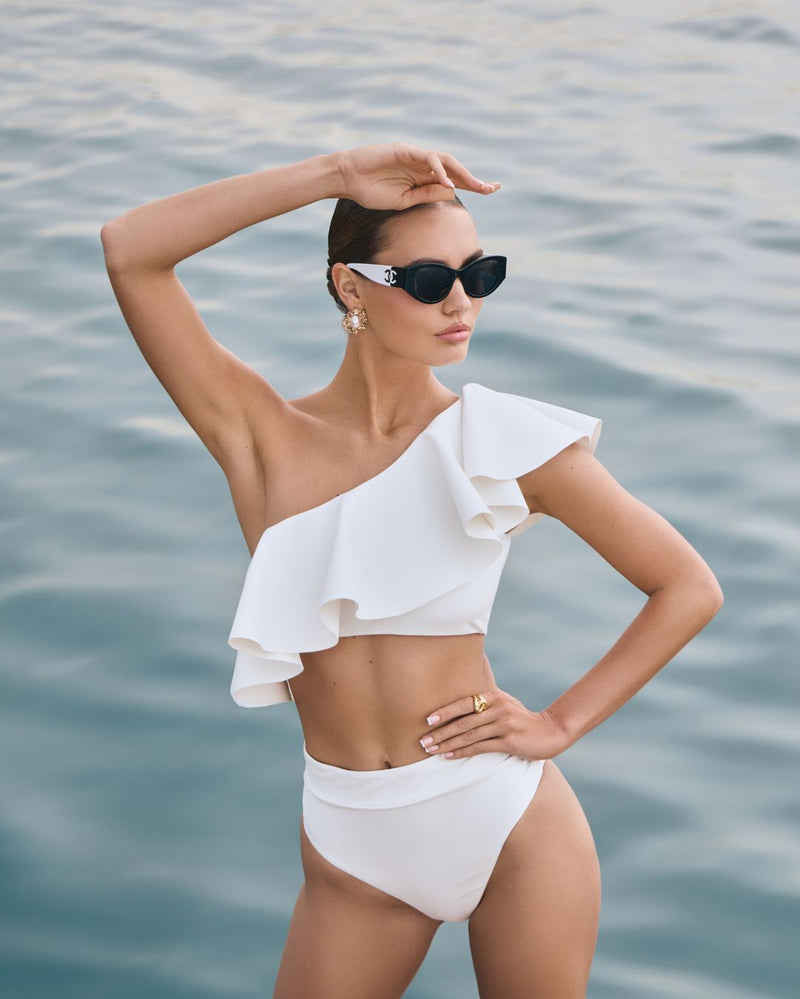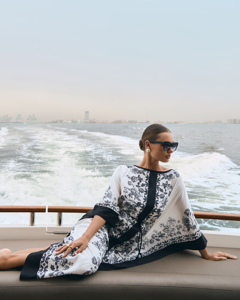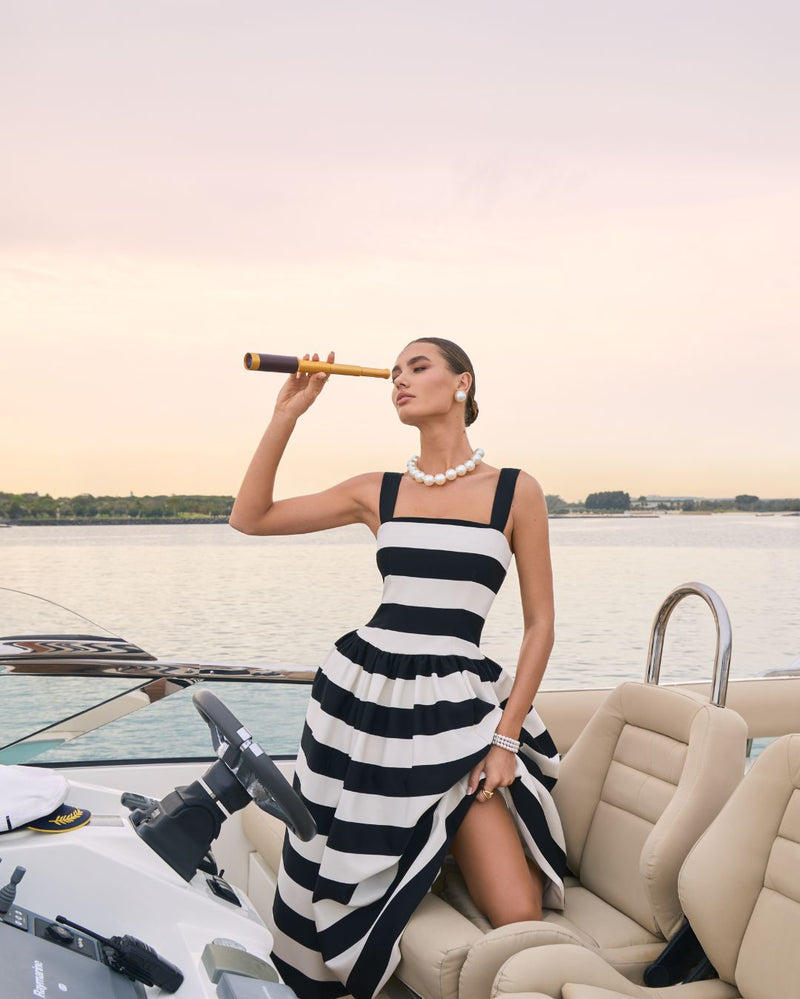 Timeless yet full of modern vision, The Yacht Club capsule embraces femininity with a side of ease. Polka dots filter through the collection, adding a playful charm to classic cuts, while deep, plunge necklines, vintage-inspired belted waists and fluid lines frame the body with style. This is a wardrobe curated for the modern muse, fulfilling her old-money fantasy, as she slips between coastline mornings and cocktail-hour rendezvous. This is a collection that wraps her in pieces that feel elevated with a story to tell.