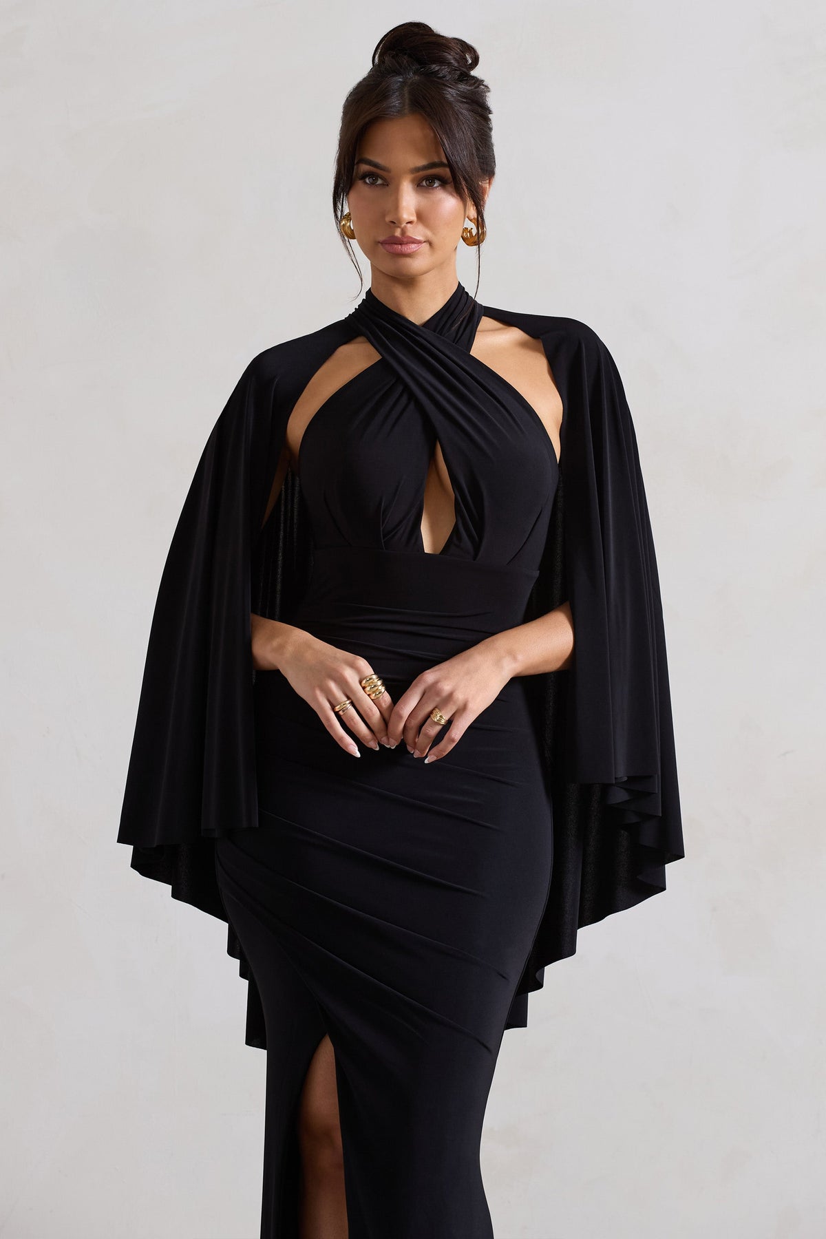 Made for high impact, its all in the details with Audrina. Wrapped in a premium stretch jersey, this black maxi dress boasts a crossed halter neckline connected to an extravagant back cape. Completed with a high-leg split and wrap skirt that effortlessly cinches your waistline, Audrina is a curve-enhancing choice for any formal occasion.